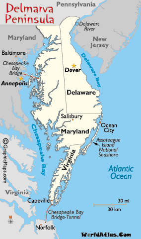 The bay is about two hundred miles from north to south and generally less than ten miles wide; it severs the state geographically, economically and culturally. The western counties of Maryland include the cities of Baltimore and Annapolis and the suburbs of Washington DC, most of the industry, commerce and population are on the western side. Across the Chesapeake Bay to the east lies a different world. The teardrop shaped Delmarva Peninsula formed between the Delaware and Chesapeake Bays is home to the whole state of Delaware and parts of two others, the eastern shore counties of Maryland and the northernmost county of Virginia.