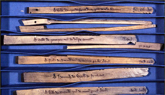 Tally sticks were a medieval accounting device: a peg of wood (usually Hazlewood) was notched with cuts of varying sizes for each denomination of money. It was then split lengthways down the middle into two pieces of unequal length so that each piece had the same notches.
