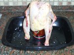 Take one raw chicken. Season inside. Insert a half-full can of beer up its bottom and set the can on roasting tray.