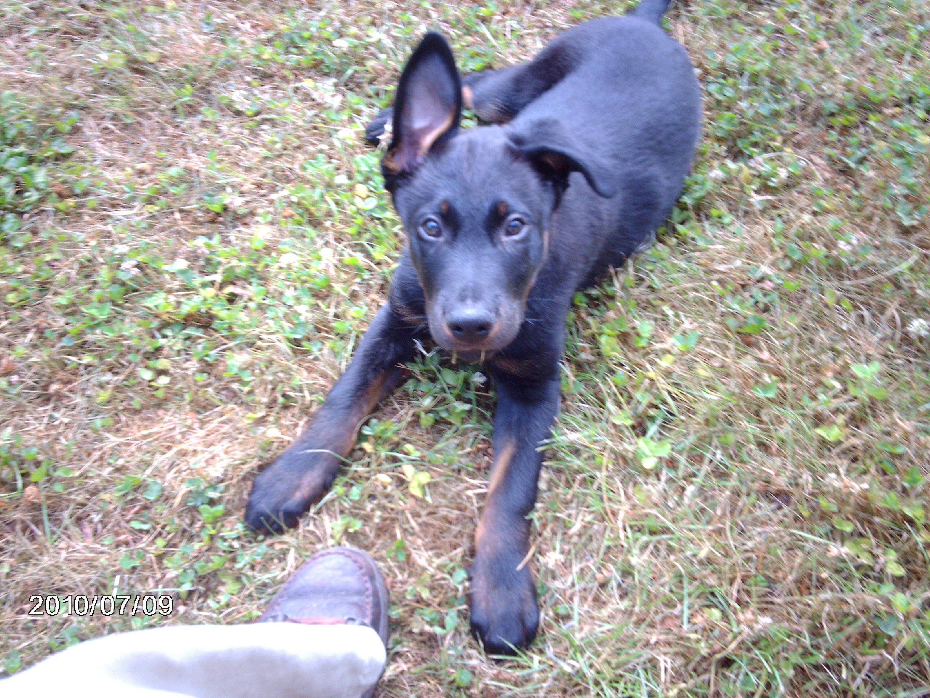 This is my latest picture of him. He looks OK in it, but his back legs had gone. When someone advised me to get a pup to replace him, my first reaction was to reject the idea. On reflection though, I changed my mind. Frenchie was a cross Beauceron, so we set out to find a pure race Beaceron pup. The result is shown below.