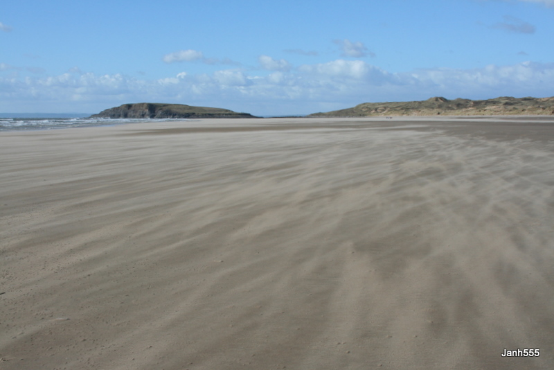 The northern end of Rhossili Bay – Llangennith. A windy day in March with the sand whipping up and stinging your face. Fabulous walking. Exciting windsurfing!