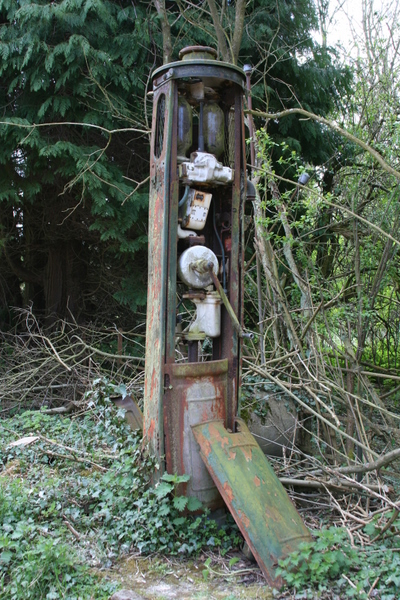 A walk near Winchcombe revealed an ancient farm petrol pump, circa 1950′s at a guess, and then, on in the lime green woodland, a stone enclosure with a roof and some tarpaulin over the floor held down by pieces of Cotswold stone.