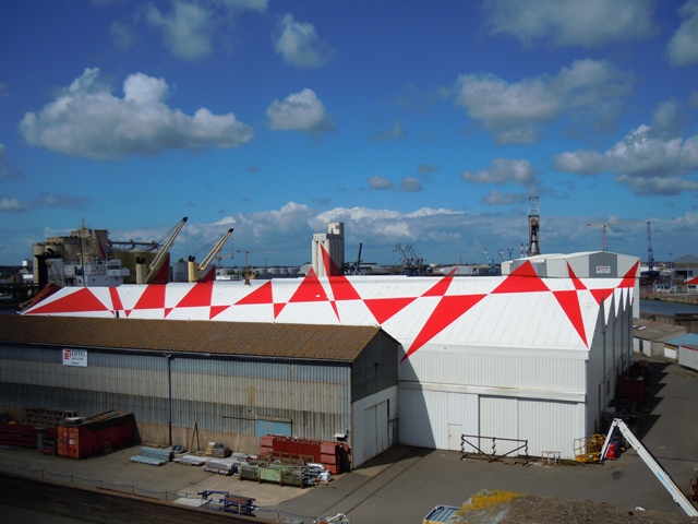 3. Red triangles on roof tops St Nazaire Saint-Nazaire: “Suite of Triangles” (2007) by Swiss artist Felice Varini, On many industrial buildings of Saint-Nazaire docks you can see strange red marks … You have to be top of a panoramic terrace to realize that these red marks form a gigantic fresco showing red triangles above and underneath a horizontal line! It was made for a contemporary art biennial called ‘Estuaire’ which took place in 2007 along river Loire estuary, from Nantes to Saint-Nazaire.