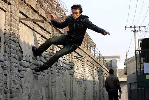 This is the unmartial art of Parkour. The concrete jungles around us are the playground we Parkours (Parkii?) use as our gym. Using freestyle climbing manoeuvres we will jump, vault or roll over the nearest obstacle and onto the next. We are an upwardly mobile association except when we‘re barrelling under hurdles or suchlike.