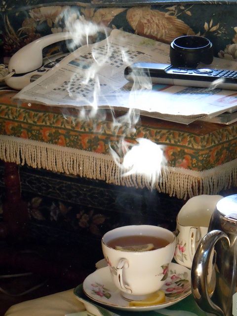 A civilised cup of tea (Earl Grey) this afternoon at my Aunt and Uncle’s house provided the photo opportunity I needed to enter the current photo competition here on the Chariot. A chance ray of sunshine lit up the water vapour as it streamed up into the air above the teapot spout as each movement in the room changed its shape and momentum – and after the tea was poured more visible clouds chaotically formed and dispersed in the sunshine.