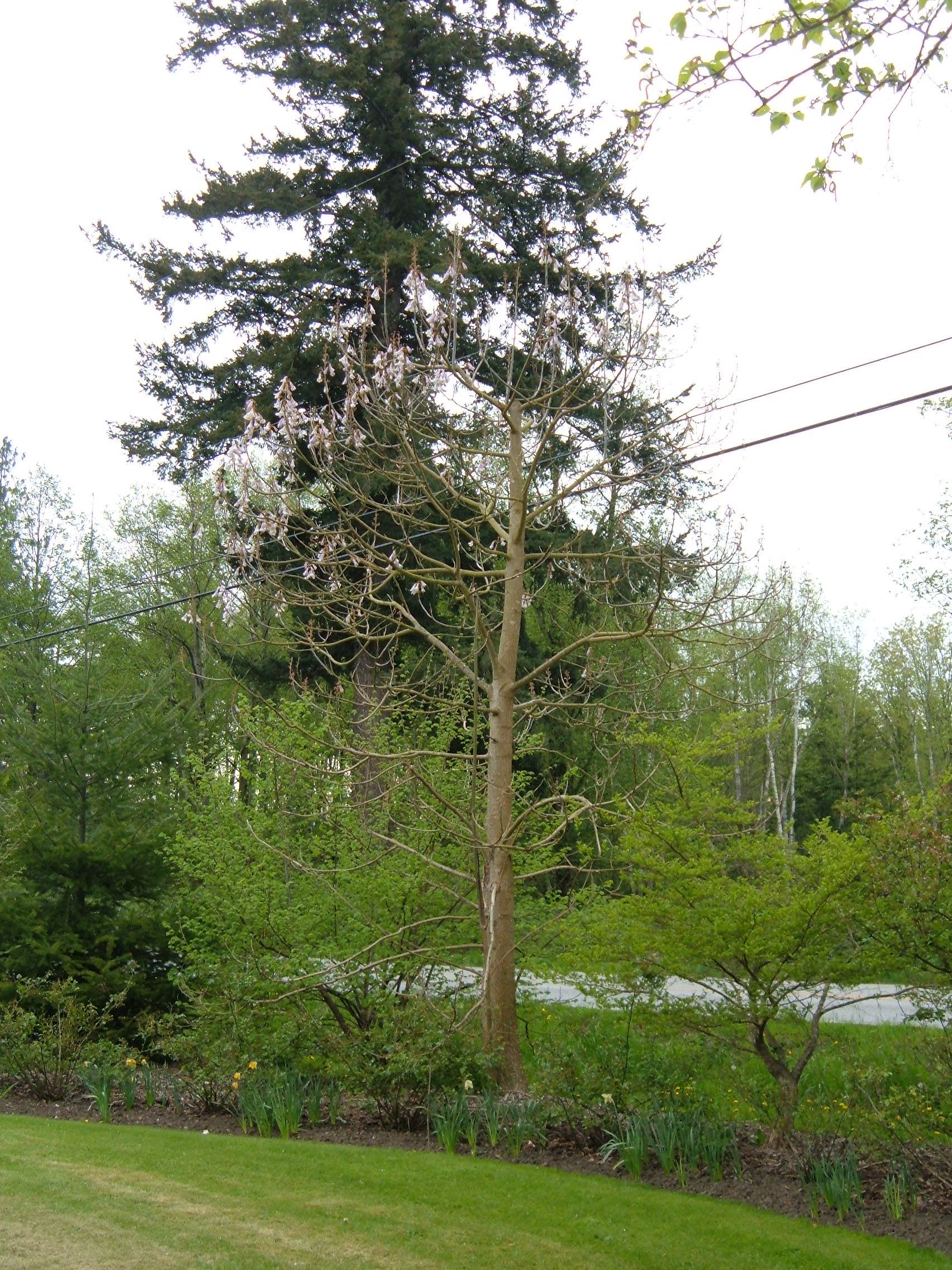 Now this may not look very much but I am rather proud of this. If you look carefully you can see some pale mauve flowers on the tree in the foreground against the Douglas fir. This is a Josephine tree (Paulownia) that I grew from seed 9 years ago, it is the first time it has flowered.