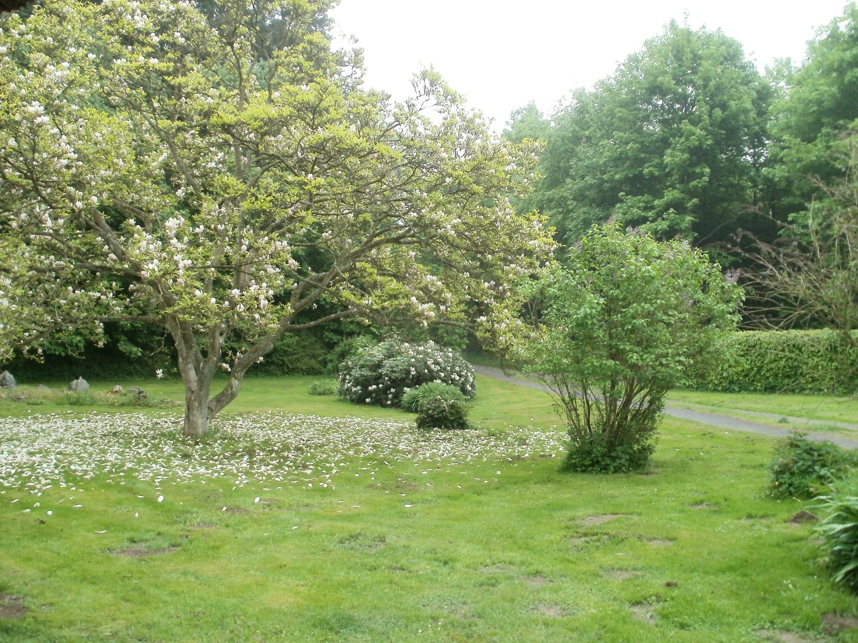 A dull, wet day today. This is looking south down the road through the woods – about half a kilometer to the lane. The majestic magnolia is now almost in leaf and the rhododendra and lilac are showing nicely, with the buddleia struggling so far. Please note remains of mole hills and the mysterious stone semi-circle to left.