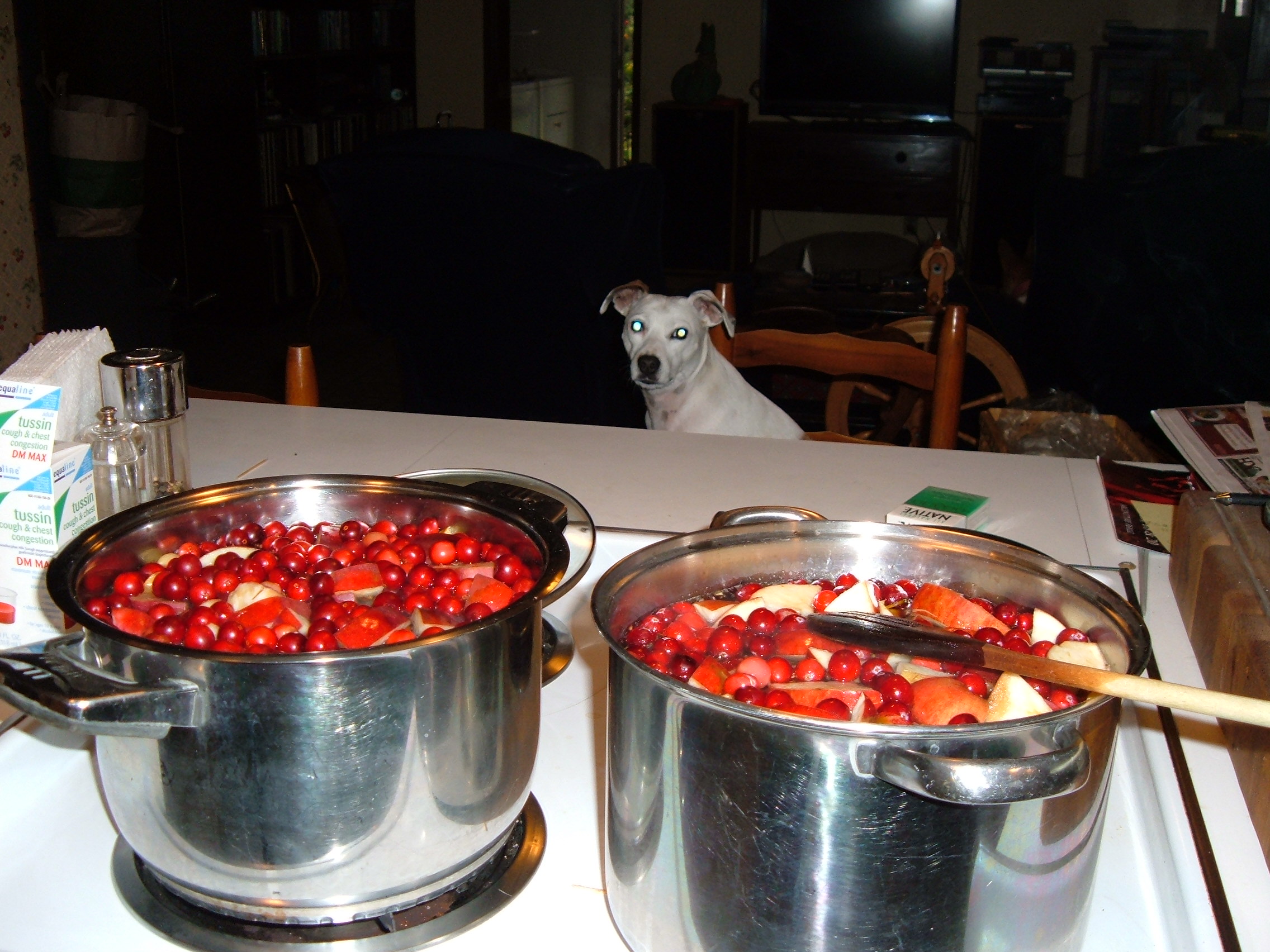 As a complete non sequitur- here she is supervising the Paradise jelly that was made in industrial quantities from donated quinces also apples and cranberries. All consenting friends were forced to accept at least 6 jars each, actually they were lined up, especially my restauranteur friends who never get this kind of homemade stuff with the promise/(threat) of more to come when they bring the jars back! Even the dog approves.