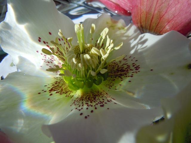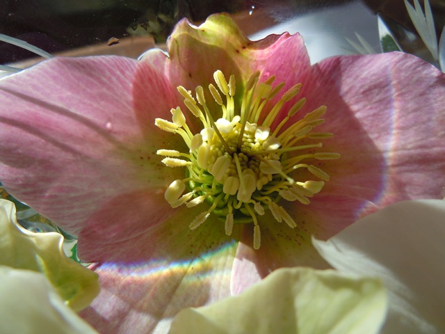 The hellebores are flowering now, hidden in the corner, and we all walk past them, without taking them in, so this afternoon, as I often do, I picked a few, and put them into a glass bowl full of water in the sunshine.