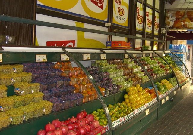It’s fruit at the front of a branch of an Israeli supermarket in the German Quarter of Jerusalem.