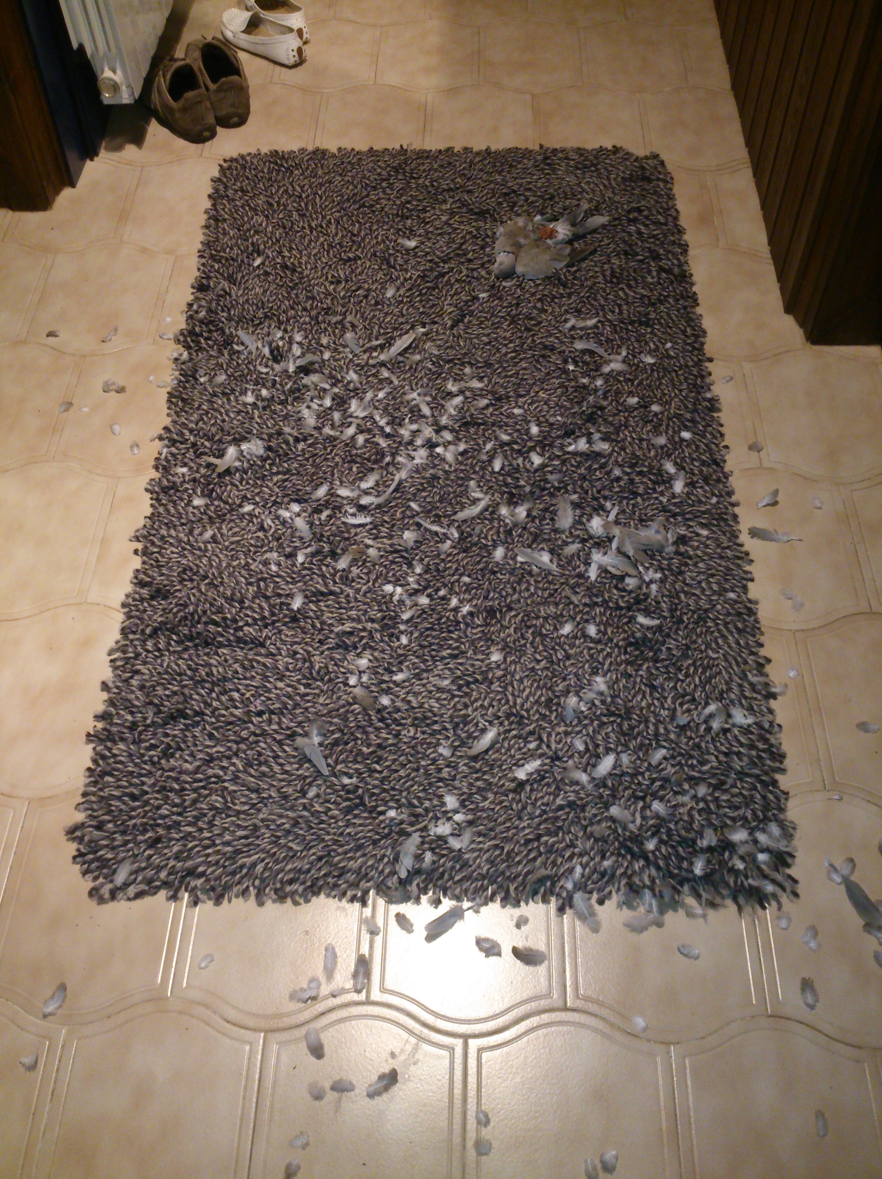 Our lovely gentle little moggy, which has only one way into the house at night and requires a five feet jump onto the window ledge before she can come into a hole in the mosquito net just big enough to squeeze through, managed to leap up with a half dead pigeon in her mouth. Hut ab!!!