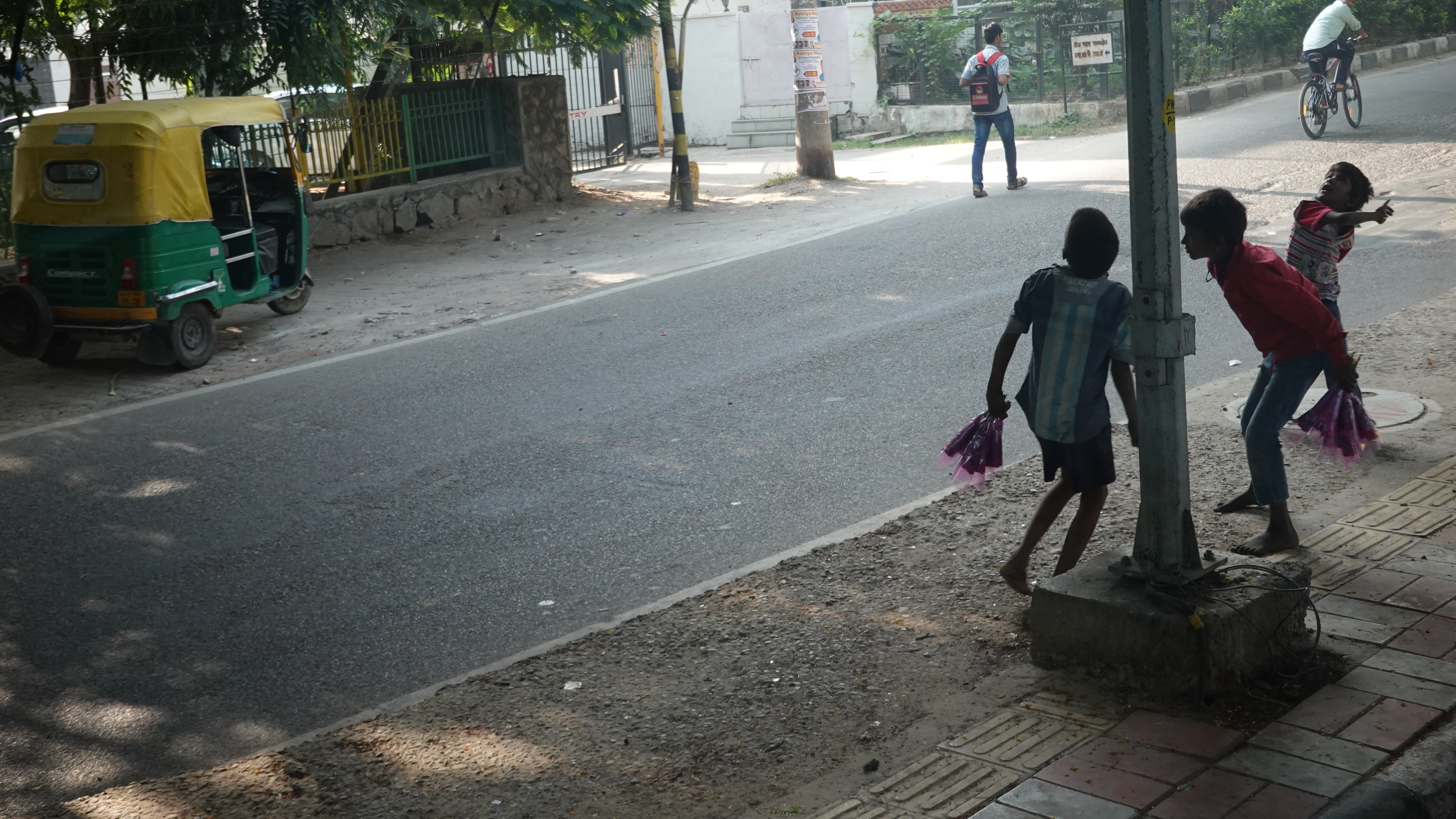 Delhi early morning – young boys playing around who were obviously supposed to be selling the flowers they were carrying.