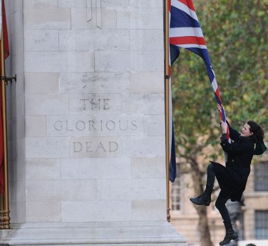 A protester disrespects the Cenotaph as he swings from a Union Jack flag on The Cenotaph in Whitehall, London, UK today as thousands of protesters gather about the education cuts.